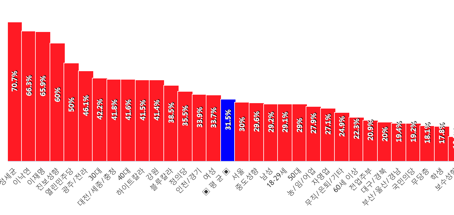 Á¤¼¼±Õ ÁöÁöÀÚ¿¡¼ 71%·Î °¡Àå ³ô°Ô ³ªÅ¸³µÀ¸¸ç, µÚ¸¦ À̾î À̳«¿¬ ÁöÁöÀÚ(66%) ÀÌÀç¸í ÁöÁöÀÚ(66%) , Áøº¸¼ºÇâ(60%) ¿¸°¹ÎÁÖ´ç(50%) ±¤ÁÖ/Àü¶ó(46%) 30´ë(42%) ´ëÀü/¼¼Á¾/ÃæÃ»(42%) 40´ë(42%) ÇÏÀÌÆ®Ä®¶ó(42%) °¿ø(41%) µîÀÇ ¼øÀ¸·Î ±¹¹ÎÀÇÈûÀ» ±âÇÇÁ¤´çÀ¸·Î ²Å¾Ò´Ù.